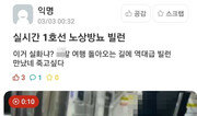 지하철 1호선 객실 안에서 방뇨하는 남성의 모습이 포착됐다.지난 3일 새벽 대학생 익명 커뮤니티에는 ‘실시간 1호선 노상방뇨 빌런’이라는 제목과 함께 영상이 올라왔다. 익명의 글쓴이는 “이거 실화냐? 여행 돌아오는 길에 역대급 빌런 만났네”라고 설명했다.그가 공개한 영상에는 서있는 상태로 객실 좌석에 소변을 보는 것으로 추정되는 남성의 모습이 고스란히 찍혔다. 영상 속 다른 좌석에는 늦은 시간인 탓에 승객들이 없던 것으로 보인다. 게시물을 본 누리꾼들은 “어메이징 1호선”, “아무것도 모르고 저기 앉으면 끔찍할 듯”, “하필 천으로 된 좌석이라 흡수했을 듯”, “게재한 시간보니 막차라서 사람 없다고 음주하고 방뇨한 듯” 등의 반응을 보였다.일부는 “난 1호선 좌석 절대 안 앉는다”, “이제부터 1호선은 절대 앉아서 못 가겠다” 등 거부감을 드러내기도 했다. 한편 지하철 내 방뇨 등의 행위는 철도안전법 제47조와 경범죄처벌법 제3조에 해당한다. 이에 따라 10만 원 이하의 벌금, 구류 또는 과료의 형으로 처벌받을 수 있다. 조혜선 동아닷컴 기자 hs87cho@donga.com}