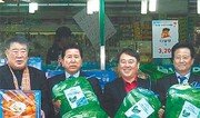 농협중앙회는 기업의 후원을 받아 가격을 30% 낮춘 감귤과 배추를 17일까지 전국의 농협 매장과 중소형 슈퍼마켓에서 판매한다고 12일 밝혔다. 12일 서울 은평구 갈현동 동성슈퍼 앞에서 김우남 민주당 의원과 최원병 농협중앙회장, 김원길 안토니 대표, 강희철 제주 서귀포농협 조합장(왼쪽부터)이 상생협력 마케팅 농산물을 들어 보였다. 농협중앙회 제공}