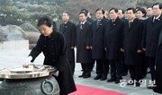 박근혜 대통령이 1일 새해 첫 일정으로 황교안 국무총리, 각 부처 장차관급 인사들, 청와대 비서진과 함께 국립서울현충원을 찾아 현충탑에 헌화한 뒤 분향하고 있다. 변영욱 기자 cut@donga.com}