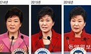 박근혜 대통령의 2014년, 지난해, 올해 신년 기자회견 모습. 13일 대국민 담화를 읽는 박 대통령의 표정은 예년에 비해 훨씬 단호했지만 기자들의 질문에 답할 때는 농담을 곁들이기도 했다. 박 대통령은 이날 빨간색 더블버튼 재킷을 입었다. 변영욱 기자 cut@donga.com·동아일보DB}