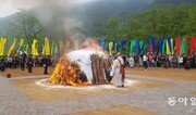 “거화(擧火)” “큰 스님 불들어갑니다!” 지난 26일 입적한 신흥사 조실(祖室) 오현 스님의 법구를 안치한 장작더미에서 마침내 불길이 하늘로 치솟자 “아미타불” “불법승”(佛法僧)을 외치는 목소리가 다비장에 울려 퍼졌다. “아이고! 스님” 하는 오열도 터져나왔다. 영원한 수행자이자 거리낌 없는 자유인의 삶을 추구하던 스님을 마지막으로 배웅하는 다비식이 30일 오후 금강산 자락의 최북단 사찰인 강원 고성군 건봉사 연화대에서 치러졌다. 안개산이라는 뜻의 법명 무산(霧山)에 어울리게 안개와 비가 오락가락했다. 하지만 궂은 날씨에도 다비장에 모인 이들은 자리를 뜰 줄 몰랐다. 이날 오전 속초 신흥사에서 열린 영결식에는 조계종 종정 진제 스님, 원로회의 의장 세민 스님, 해인사 방장 원각 스님, 총무원장 설정 스님 등 각계 인사 1000여명이 참석했다. 행사는 영결사와 법어, 추도사, 조사, 조시 등으로 1시간여동안 진행됐다. 진제 스님은 법어에서 “설악의 주인이 적멸에 드니 산은 슬퍼하고 골짝의 메아리는 그치지 않는다. 무산 대종사께서 남기신 팔십칠의 성상(星霜)은 선(禪)과 교(敎)의 구분이 없고, 세간(世間)과 출세간(出世間)에 걸림이 없던 이 시대의 선지식의 발자취였다”고 기렸다. 이근배 시인은 “그 높은 법문 그 천둥 같은 사자후를 어디서 다시 들을 수 있겠습니까”라며 “백세(百世)의 스승이시며 어버이시며 친구이시며 연인이셨던 오직 한 분!”이라고 스님을 그리워했다. 만해마을이 있는 인제군 용대리의 전 이장 정래옥 씨는 “큰스님은 신도들이 용돈을 드리는 것을 푼푼이 모아 아낌없이 주민들에게 베풀어 주셨다”며 “마음으로라도 큰스님께 은혜를 갚으며 살아가고자 했으나 훌쩍 떠나가셨다”라고 추도했다. 고성=김갑식 전문기자 dunanworld@donga.com}