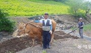 해월 최시형의 행적이 있는 강원 영월군 중동면 직동2리 돌배마을에는 뜻밖에도 소를 이용한 쟁기질을 볼 수 있었다. 이 마을은 주변 밭에 콩과 옥수수를 주로 심는데 경사가 가파른 탓에 기계를 사용할 수 없기 때문이다. 주민 양종석 씨(62)가 15세 암소를 앞세워 쟁기질로 농사일을 하고 있다. 일은 4월부터 6월말에 집중되는데 하루 일당은 20만 원 수준이다. 외지에서 생활하다 15년 전 귀향했다는 양 씨는 “공기와 물, 사람 모두 좋아 여기만한 곳이 없다”며 “암소가 나이가 들기는 했지만 앞으로 4~5년은 거뜬하다”고 말했다. 이 마을의 이정표에는 백운산 자락의 해발 750m 지대에 있고 음력 9월이면 민물 김을 채취할 수 있고 조개껍질 같은 바다생물의 화석이 발견된다고 기록돼 있다. 또 1949년 빨치산에 의해 우익청년단원 10여명이 학살당했고, 조선 후기에는 동학도와 관군의 교전으로 많은 사람이 죽어 ‘피 직(稷)’ ‘골 동(洞)’ 자를 써서 직동(稷洞), ‘핏골’로 불렸다고 한다. 이장 윤경섭 씨(54)는 “해월 최시형이 은거한 것으로 알려진 동굴이 인근 산에 남아 있다”며 “우리 역사의 흔적을 잘 살려 스토리텔링이 있는 마을로 가꿔 나가겠다”고 말했다.영월=김갑식 전문기자 dunanworld@donga.com}