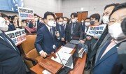 더불어민주당이 26일 이른바 ‘검수완박(검찰 수사권 완전 박탈)’ 중재안을 국회 법제사법위원회 법안심사 제1소위원회에서 단독으로 처리했다. 거대 양당의 격한 충돌이 연일 이어지면서 윤석열 정부 출범을 2주 앞두고 정치권이 격랑에 휩싸이고 있다. 민주당은 이날 저녁 법사위 전체회의 통과까지 시도했지만 국민의힘은 안건조정위원회 구성을 요구하며 맞섰다. 안건조정위 무력화를 위해 ‘위장 탈당’ 편법을 썼던 민주당은 법사위 단계를 모두 마무리 짓고 이르면 27일 본회의를 열어 중재안 통과를 시도한다는 계획이다. 이에 맞서 국민의힘은 “필리버스터(무제한 토론) 등 국회법이 정한 모든 절차와 수단을 사용하겠다”고 했다. 국민의힘은 “공직자·선거 범죄에 대한 검찰 직접 수사권을 포함시켜야 한다”며 이날 오후 긴급 의원총회에서 중재안 재협상을 만장일치로 의결했다. ‘정치 야합’이라는 비판이 거세지자 국민 여론을 앞세워 재협상을 요구한 것. 하지만 민주당이 법사위 소위에서 단독으로 표결 처리하고 전체회의까지 열자 국민의힘 의원들은 회의장을 찾아 항의에 나섰다. 권성동 원내대표는 “민주당은 추가 논의 제안도 반대하고 합의 파기를 선언했다”며 “최소한 의장 중재안대로 만들 책임이 있는데 과도하게 민주당에 유리한 법안을 만들었다”고 날을 세웠다. 중재안에선 검찰의 별건 수사를 막기 위해 ‘범죄의 단일성과 동일성을 벗어나는 검찰 수사를 금지한다’고 합의했는데, 민주당이 이를 과도하게 해석해 ‘동일한 범죄사실의 범위 내에 한한다’는 문구를 신설했다는 것이다. 민주당은 이날 중재안에 정의당 측 제안을 반영해 검찰 수사 범위를 6대 범죄 중 부패와 경제범죄 두 가지로 제한하되 6·1지방선거를 고려해 올해 12월 말까지 선거 범죄에 대해 수사권을 유예하는 부칙을 담았다. 민주당 윤호중 비상대책위원장은 이날 오후 의원총회에서 국민의힘을 겨냥해 “합의문의 잉크도 마르기 전에 윤 당선인과 이른바 ‘소통령’으로 불리는 사람(한동훈 법무부 장관 후보자)의 초법적인 행위에 의해 국회 합의가 침탈당한 것”이라고 했다. 박홍근 원내대표도 “윤 당선인은 검찰공화국 목표에 있어 걸림돌이 되는 입법은 막겠다는 뜻을 내비친 것”이라며 “협치 파괴이자 명백한 국회 장악 시도”라고 했다. 강경석 기자 coolup@donga.com권오혁 기자 hyuk@donga.com}