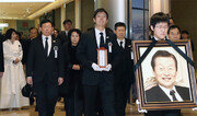 19일 타계한 신격호 롯데그룹 명예회장의 영결식이 22일 오전 7시 서울 롯데월드몰 콘서트홀에서 열렸다. 고인의 장남 신동주 전 롯데홀딩스 부회장, 차남 신동빈 롯데그룹 회장을 비롯해 유족과 롯데그룹 임직원 1400여 명이 고인의 마지막 가는 길을 지켰다. 구자열 LS그룹 회장, 김윤 삼양그룹 회장 등도 영결식에 참석했다. 영결식은 신동주 전 부회장의 아들 정열 씨가 영정을, 신동빈 회장의 아들 유열 씨가 위패를 들고 들어서며 시작됐다. 고인의 부인 시게미쓰 하쓰코(重光初子) 여사, 장녀 신영자 롯데장학재단 이사장, 동생인 신준호 푸르밀 회장, 신정희 동화면세점 부회장 등이 무대에 올라 고인을 추모하며 헌화했다. 신동빈 회장은 “아버지는 타지에서 고난과 역경 끝에 성공을 거두셨을 때에도 조국을 먼저 떠올리셨고, 기업이 조국의 발전에 기여해야 한다는 생각을 평생 실천하셨다”면서 “저는 그런 아버지의 모습을 통해 기업인의 사명감과 책임감을 배웠다”고 말했다. 점차 목소리가 떨리고 목이 잠기던 신 회장은 “역경과 고난이 닥쳐올 때마다 아버지의 태산 같은 열정을 떠올리며 길을 찾겠다”며 말을 맺었다. 신동주 전 부회장은 가족 대표로 한 인사말에서 “여러분의 따뜻한 위로와 방문에 저의 선친께서도 무척 기뻐하시리라 생각한다”면서 “가족들은 앞으로 선친의 가르침을 가슴 깊이 새기고 살아가겠다”고 말했다. 명예장례위원장인 이홍구 전 국무총리는 “당신은 참으로 위대한 거인이었다”면서 “모국의 경제 발전에 도움이 되겠다는 일념으로 이 땅에서 사업을 시작했고, 당신이 일으킨 사업은 대한민국 경제를 떠받치는 기둥이 됐다”고 말했다. 해외 출장으로 참석하지 못한 반기문 전 유엔 사무총장은 추도사에서 “대한민국 경제 발전을 견인했던 거목, 우리 삶이 어두웠던 시절 경제 성장의 앞날을 밝혀주었던 큰 별이었다”고 애도했다. 고인의 한평생 모습을 담은 영상이 나오자 유가족과 임직원들은 눈을 떼지 못했다. 젊은 시절 한국과 일본을 오가고, 서울롯데호텔 롯데월드 롯데월드타워 등의 건립을 진두지휘하던 모습이 상영됐다. “미처 못 이룬 꿈이 있다면 우리가 이루겠습니다. 당신을 영원히 사랑합니다. 이제 편히 쉬십시오”라는 말이 나오자 일부 임직원은 눈시울을 붉혔다. 영결식 직후 운구 차량은 고인의 평생 숙원사업이었던 롯데월드타워를 한 바퀴 돌고 고향 땅이자 장지인 울산 울주군 삼동면 둔기리 선영으로 떠났다. 롯데그룹 임직원 1000여 명이 타워를 빙 둘러싸고 서서 운구 차량이 지나자 목례했다. 지나가던 시민들도 잠시 발걸음을 멈추고 고인의 마지막을 지켜봤다. 롯데그룹 관계자는 “‘고향 땅에서 잠들고 싶다’는 고인의 뜻에 따라 고향 땅이 한눈에 내려다보이는 곳에 모셨다”고 전했다.신희철 기자 hcshin@donga.com}