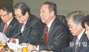 박용만 대한상공회의소 회장(가운데)이 26일 서울 중구 대한상공회의소 국제회의장에서 열린 중장기 경제어젠다 전략회의에서 인사말을 하고 있다. 이날 김무성 새누리당 대표(왼쪽에서 두 번째)와 문재인 더불어민주당 대표(왼쪽에서 네 번째)는 축사를 전하며 각자 다른 경제 살리기 방안을 제시했다. 이들은 회의가 끝나기도 전에 자리를 빠져나갔다. 홍진환 기자 jean@donga.com}