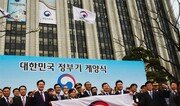태극 문양의 새 대한민국 정부기가 29일 서울 종로구 세종로 정부서울청사 등 전국 10개 정부청사에서 동시 게양됐다. 홍윤식 행정자치부 장관(가운데 태극문양 바로 위)과 행정자치부 직원이 이날 정부서울청사에서 열린 정부기 게양식에서 기념 촬영을 하고 있다(맨 아래). 새 정부기는 기존 무궁화꽃 문양기(왼쪽 사진)에서 태극 문양으로 바뀌었다. 홍진환 기자 jean@donga.com}