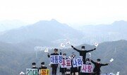3.1절을 이틀 앞둔 27일 북한산 안전봉사단 단원들이 서울 은평구 북한산 족두리봉 바위에서 3.1절 103주년을 기념하고 열흘 남짓 앞으로 다가온 제20대 대통령선거 투표를 독려하는 퍼포먼스를 펼쳐 보이고 있다. 신원건 기자 laputa@donga.com}
