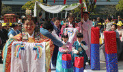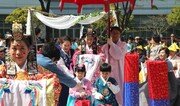 16일 부산 부산진구청 마당에서 열린 다문화 부부 합동 전통혼례식에서 신부가 입장하고 있다. 다문화 가정의 안정적인 정착을 위해 부산진구가 마련한 이날 결혼식에서는 개인 사정으로 식을 올리지 못한 채 살던 다문화 부부 3쌍이 혼례를 치렀다.부산=박경모 기자 momo@donga.com}