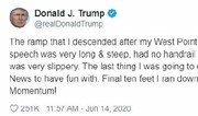 도널드 트럼프 미국 대통령이 74세 생일(14일)을 하루 앞두고 부자연스럽게 거동해 또다시 건강 이상설이 제기됐다.지난 13일(현지시간) 미국의 육군사관학교인 웨스트포인트 졸업식을 찾은 트럼프 대통령은 축사를 위해 연단에 올랐다.트럼프 대통령은 오른손으로 컵을 들어 물을 마시려다가 잠시 멈칫하고는 왼손으로 잔을 받쳤다.축사를 마친 후에는 연단을 내려가면서 엉거주춤한 자세로 어렵게 내려가는 모습을 보였다. 경사로 마지막에서는 넘어질 듯 후다닥 발을 딛기도 했다. 경사로가 특히 가파른 것도 아니었다.트위터에서는 두 장면을 편집한 영상이 떠돌기 시작했다. ‘트럼프가 아프다(#TrumpIsUnwell)’, ‘트럼프는 괜찮지 않다(#TrumpIsNotWell)’ 등의 해시태그가 급속히 확산됐다. ‘하이힐을 처음 신은 소녀 같다’고 놀리는 이들도 있었다.일부에서는 트럼프 대통령이 초기치매 또는 가벼운 뇌졸중을 앓고 있을 수 있다는 의문을 제기하기도 했다. 미 시사주간지 뉴스위크는 이같은 해시태그가 이틀 만에 인기 주제가 됐다고 14일 전했다.민주당 대선후보인 조 바이든 전 부통령 측의 한 인사는 “왜 트럼프가 연단을 내려오는 데 어려움을 겪는 것인가. 파킨슨병이 있는 건가. 우린 답을 들어야 한다”고 트위터에 적었다.이에 트럼프 대통령은 너무 미끄러운 계단이어서 조심하느라 그랬다고 일축했다.트럼프 대통령은 트위터에 “경사로는 매우 길고 가팔랐고, 손잡이도 없었다. 무엇보다 매우 미끄러웠다. 가장 하지 말아야 할 건 가짜 뉴스가 좋아할 넘어지는 것이었다. 마지막 10피트는 달려 내려왔다”고 주장했다.트럼프 대통령의 건강 이상설은 취임 후부터 종종 제기됐다. 지난해 말에는 비공개로 건강검진을 받았다가 의혹이 불거지기도 했다. 당시 트럼프 대통령은 “의사들은 나에게 ‘셔츠를 벗어 멋진 가슴을 보여주라 한다. 이런 가슴을 본 적 없다’고 한다”고 강조했다.박태근 동아닷컴 기자 ptk@donga.com}