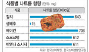 시중에 판매되는 김치에 포함된 나트륨 함량이 햄, 소시지 등보다 높은 것으로 조사됐다. 나트륨은 우리 몸에 꼭 필요한 영양소지만 과도하게 섭취하면 고혈압, 심혈관질환 등을 유발할 수 있어 덜 짠 김치를 널리 보급할 필요가 있다는 지적이 나왔다. 한국소비자원과 한국소비생활연구원은 22일 대형마트와 홈쇼핑 등에서 판매되는 16개 업체의 포기김치 16종을 시험 분석한 결과 김치 100g당 나트륨 함량이 540∼727mg으로 평균 643mg 들어 있었다고 밝혔다. 스모크햄(612mg), 비엔나소시지(611mg)보다 높은 수준이다. 한국인 1인당 하루평균 배추김치 섭취량이 70g인 점을 감안하면 김치로만 하루 450mg의 나트륨을 먹는 셈이다. 세계보건기구(WHO) 하루 권장 섭취량(2000mg)의 22.5%다. 일반적으로 소금의 40%는 나트륨 성분이다. 송규혜 소비자원 식품미생물팀장은 “한국인의 하루평균 나트륨 섭취량은 WHO 권장 섭취량의 2.4배(4831mg)나 된다”며 “김치에 ‘나트륨 등급제’를 도입해 ‘짠맛 김치’, ‘보통 김치’, ‘저염 김치’ 등으로 나눠 판매하는 등 나트륨 섭취를 줄이는 방안을 모색해야 한다”고 말했다. 김유영 기자 abc@donga.com}