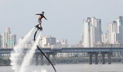 17일 서울의 낮 기온이 33도를 기록하는 등 전국적으로 폭염이 기승을 부리는 가운데 서울 한강시민공원 여의도지구에서 한 시민이 플라이보드를 타며 더위를 식히고있다. 김재명 기자 base@donga.com}