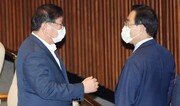 더불어민주당 김태년 원내대표(왼쪽)와 국민의힘 주호영 원내대표가 7일 오전 서울 영등포구 여의도 국회에서 열린 국회 본회의에 참석해 대화를 나누고 있다. 김재명 기자 base@donga.com}