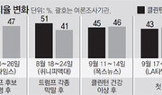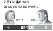미국 대선의 분수령이었던 지난달 26일 1차 TV토론 이후 민주당 힐러리 클린턴 후보가 완연한 상승세를 타며 공화당 도널드 트럼프 후보를 다시 제치고 있는 것으로 나타났다. 미 여론조사기관 퍼블릭폴리시폴링(PPP)이 토론 다음 날부터 이틀간 실시해 지난달 29일(현지 시간) 공개한 여론조사에 따르면 전국 지지율은 클린턴이 49%, 트럼프는 45%였다. 토론 당일 공개된 블룸버그 여론조사에선 두 후보가 46%로 동률이었다. 특히 승부처인 콜로라도, 플로리다, 노스캐롤라이나, 버지니아, 펜실베이니아 5개 핵심 경합주의 지지율이 초박빙에서 클린턴의 근소한 우세로 바뀌었다. 콜로라도(선거인단 9명)의 경우 클린턴은 51%의 지지율로 트럼프(44%)를 7%포인트 앞섰다. 플로리다(29명)에서도 클린턴 48%, 트럼프 45%로 3%포인트 차가 났다. 경합주 중 가장 경쟁이 치열한 노스캐롤라이나(15명) 펜실베이니아(20명)에서도 클린턴이 다시 앞서 나가기 시작했다. 9월 중순 들어 2주 연속 트럼프 승리를 점쳤던 라스무센 여론조사 결과도 클린턴 우세로 바뀌었다. 지난달 29일 발표한 4자 대결 여론조사에서 클린턴은 42% 대 41%로 트럼프를 오차 범위 내에서 앞섰다. 지난달 14일과 22일 같은 기관에서 발표한 여론조사에서 클린턴은 트럼프에게 각각 40% 대 42%, 39% 대 44%로 뒤졌다. 이런 가운데 전직 공화당 의원과 공화당 정권에서 백악관 고위직을 지낸 40명이 29일 클린턴 지지를 선언했다고 폴리티코가 보도했다. 이와 함께 지금까지 대선에서 특정 후보를 지지한 적이 없는 미 전국 일간지 USA투데이는 이날 사설에서 “트럼프는 대통령직에 부적합한 위험한 선동가”라며 트럼프에게 투표하지 말 것을 독자들에게 촉구했다.워싱턴=이승헌 특파원 ddr@donga.com}