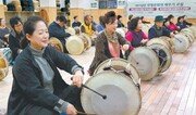 7일 부산 서구 구덕민속예술관에서 시민들이 부산시 무형문화재 18호 ‘부산 고분도리걸립’ 가운데 장구 장단을 배우고 있다. 부산 서구 서대신동 일대를 일컫던 고분도리에서 주로 행해진 고분도리걸립은 다양한 굿판을 벌여 마을의 복을 빌어주고 대가로 쌀이나 돈을 받던 풍물굿이다.부산=박경모 기자 momo@donga.com}