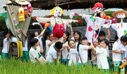 6일 서울 서대문구 농협 농업박물관 야외 농원에서 ‘만화 캐릭터 허수아비 만들기’ 행사에 참가한 서울 미동초등학교 학생들이 직접 만든 허수아비를 들고 논으로 향하고 있다. 최혁중 기자 sajinman@donga.com}