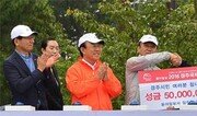 김재호 동아일보 사장이 16일 경주국제마라톤 개회식에서 최양식 경주시장에게 구호성금 5000만 원을 전달하고 있다. 앞줄 왼쪽부터 이준용 KBSN 사장, 김관용 경북도지사, 최 시장, 김 사장, 배호원 대한육상연맹 회장. 경주=최혁중 기자 sajinman@donga.com}