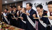 김재수 농림축산식품부 장관(오른쪽에서 두 번째)과 김영춘 국회 농림축산식품해양수산위원장(오른쪽에서 세 번째)이 9일 국회 의원회관에서 닭고기와 오리고기 시식 행사를 벌이고 있다. 이 행사는 조류인플루엔자(AI)로 감소한 가금류 소비를 촉진하기 위해 마련됐다. 최혁중 기자 sajinman@donga.com}
