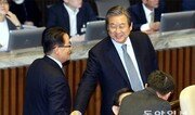국민의당 박지원 대표(왼쪽)와 바른정당 김무성 의원이 16일 오후 국회 본회의장에서 정국 정상화 논의를 위한 긴급 현안 질문에 참석해 인사를 나누고 있다. 최혁중 기자 sajinman@donga.com}