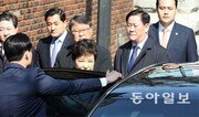 30일 오전 박근혜 전 대통령이 영장실질심사를 받기 위해 서울 강남구 삼성동 사저를 떠나는 모습을 최경환 자유한국당 의원(오른쪽에서 두 번째) 등 친박계 의원들이 바라보고 있다. 최혁중 기자 sajinman@donga.com}