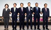 19일 오전 야 4당 원내대표가 국회 회동을 하던 중 갑자기 병풍이 쓰러지자 바른정당 주호영, 국민의당 주승용, 더불어민주당 우상호 원내대표(왼쪽부터)가 놀란 표정으로 병풍을 막고 있다. 오른쪽은 정의당 노회찬 원내대표. 최혁중 기자 sajinman@donga.com}