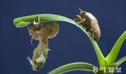 뜨거운 여름밤, 서울 노원구 덕릉로의 한 아파트 단지 화단. 매미 유충이 성충으로 탈바꿈하고 있다. 땅 속에서 6, 7년을 기다린 매미 유충은 구멍을 뚫고 세상 밖으로 나와 화초에 몸을 단단히 고정한 채 2, 3시간의 탈피 과정을 거쳐 날개 달린 성충으로 변한다. 박영대 기자 sannae@donga.com}