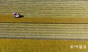 22일 전남 담양군 봉산면의 들녘에서 한 농민이 콤바인으로 벼를 수확하는 장면을 하늘에서 드론으로 촬영했다. 마치 황금빛 물결 같은 논을 가지런히 빗질하는 것처럼 보인다.담양=박영철 기자 skyblue@donga.com}