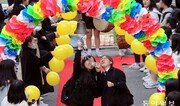 대입 수능시험을 하루 앞둔 13일 광주광역시 남구 설월여자고에서 수험생들이 후배들의 응원과 함께 ‘수능 대박 종’을 치며 학교를 나서고 있다.광주=박영철 기자}
