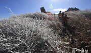 수능 한파에 14일 광주시 무등산국립공원 정상 부근 누에봉에 상고대가 활짝 폈습니다. 상고대는 수증기가 승화하거나 기온이 0℃ 이하로 내려가면서 안개 등 미세한 물방울이 순간적으로 얼면서 생깁니다. 광주=박영철기자 skyblue@donga.com}