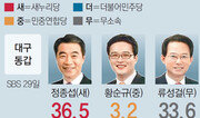 4·13총선 대구 동갑에서 새누리당 공천을 받은 정종섭 후보(전 행정자치부 장관)와 당에서 컷오프(공천 배제)돼 무소속으로 출마한 류성걸 후보(초선)가 오차범위 내 접전을 벌이는 것으로 조사됐다. 29일 SBS 보도에 따르면 정 후보는 36.5%의 지지를 얻어 현 의원인 류 후보(33.6%)와 오차범위(표본 오차는 95% 신뢰 수준에 ±4.4%포인트) 내에서 경합하는 것으로 나타났다. 정 후보는 ‘진박(진짜 친박근혜)’으로 분류된다. 대구 민심이 아직 진박 후보들과 무소속 현역 후보 사이에서 팽팽히 맞서 있는 걸로 분석된다. 역시 SBS 조사에서 대구 수성갑의 경우 경기도지사 출신인 새누리당 김문수 후보가 34.6%의 지지를 얻어 더불어민주당 김부겸 후보(52.9%)에게 밀리는 것으로 조사됐다. 부산에선 새누리당의 ‘싹쓸이’ 구상에 이상 신호가 감지되고 있다. 사상은 더불어민주당 문재인 전 대표의 지역구로 ‘박근혜 키즈’로 불리는 새누리당 손수조 후보와 문 전 대표의 뜻에 따라 공천을 받은 더민주당 배재정 후보(초선·비례대표)가 경합할 것으로 보였다. 그러나 새누리당에서 컷오프된 뒤 무소속 출마한 장제원 후보가 선전하면서 선거 판세가 급변했다. 28일 중앙일보 보도에 따르면 장 후보의 지지율은 34.0%로 손 후보(22.9%)보다 11.1%포인트 높았다. 배 후보는 20.9%였다. 장 후보는 옛 친이(친이명박)계 출신으로 이 지역에서 18대 국회의원을 지냈다. 이번에 새누리당에 공천 신청을 했지만 사상이 여성 우선추천 지역으로 선정되자 탈당했다. 또 29일 부산일보 조사에 따르면 ‘북-강서갑’의 경우 새누리당 박민식 후보(재선)가 38.5%를 얻어 더민주당 전재수 후보(51.8%)에게 밀리는 것으로 나타났다. 두 후보는 이번이 세 번째 맞대결로 18, 19대 총선 때는 모두 박 후보가 승리했다.고성호 기자 sungho@donga.com}
