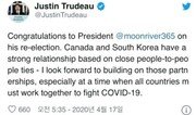 쥐스탱 트뤼도 캐나다 총리가 “문재인 대통령의 재선을 축하한다”는 메시지를 트위터에 올렸다가 삭제했다.트뤼도 총리는 17일 트위터에 “문재인 대통령의 재선을 축하한다. 캐나다와 한국은 긴밀한 인적 관계를 바탕으로 강력한 관계를 맺고 있다”라고 적었다.이어 “나는 특히 코로나19와 싸우기 위해 모든 나라가 협력해야 하는 이 시기에 이 같은 파트너십을 다져나가길 기대한다”고 전했다.이는 캐나다의 정치 제도와 혼동해 올린 글로 보인다. 캐나다는 대통령이 행정권을 행사하는 한국와 달리, 의원내각제를 택하고 있다.의원내각제는 원내 1당에서 선출한 총리가 국정을 운영하기 때문에 총선에서 여당이 승리하면 총리직을 유지할 수 있다.트뤼도 총리는 이후 실수를 깨달았는지 트윗글을 삭제했다.박태근 동아닷컴 기자 ptk@donga.com}
