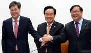 선거구 획정 등을 논의할 국회 정치개혁특별위원회 위원장으로 선임된 이병석 새누리당 의원(가운데)과 여야 간사인 정문헌 새누리당 의원(왼쪽), 김태년 새정치민주연합 의원(오른쪽)이 18일 전체회의에 앞서 손을 맞잡고 기념촬영을 하고 있다. 변영욱 기자 cut@donga.com}