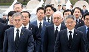 문재인 새정치민주연합 대표(앞줄 왼쪽) 일행이 19일 서울 국립4·19민주묘지를 참배한 뒤 걸어나오고 있다. 문 대표는 이날 이곳에서 열린 제55주년 4·19혁명 기념식에는 참석하지 않았다. 변영욱 기자 cut@donga.com}