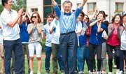 새정치민주연합 문재인 대표(가운데)가 14일 국회 본관 뒤 운동장에서 열린 새정치연합 보좌진 체육대회에 참석해 발로 고무신 던지기 게임을 하면서 두 팔을 들며 웃고 있다. 당내 갈등이 심각한 것과 대조적인 분위기다. 변영욱 기자 cut@donga.com}