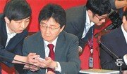 21일 국회에서 열린 새누리당 최고위원회의에서 유승민 원내대표(왼쪽에서 두 번째)와 김무성 대표(오른쪽)가 진지한 표정으로 당이 개발한 ‘소통 앱’을 스마트폰에 내려받고 있다. 변영욱 기자 cut@donga.com}
