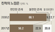 김모 씨(35)가 중고교에 다닐 때만 해도 명절이면 집안 잔치가 열렸다. 김 씨는 부모 형제와 함께 큰집으로 향했다. 30명이 넘는 친척이 모였다. 차례가 끝나도 집에 가는 이가 없었다. 그런데 올해 김 씨 가족은 큰집에 가지 않는다. 그 대신 가족끼리만 명절을 지내기로 했다. 분위기는 10여 년 전 바뀌기 시작했다. 명절 때 모여도 차례만 지내고 자리를 뜨는 친척이 늘어났다. 남은 사람도 운전 때문에 오래 술잔을 기울이지 않았다. 그렇게 몇 년 지나니 사촌끼리도 서먹해졌다. 결혼이라도 해야 연락이 오갈 정도였다. 김 씨는 “큰아버지와 큰어머니는 성함과 연세마저 가물가물할 지경”이라며 “명절이 돼도 전화로 안부 정도만 물을 생각”이라고 말했다. 친척을 편안하게 느끼는 사람은 줄고 불편하게 여기는 사람은 늘고 있다. 주간동아는 지난달 25∼27일 여론조사 기관인 폴리컴에 의뢰해 전국 만 19세 이상 남녀 1000명을 대상으로 ‘친척이란 무엇인가’를 주제로 휴대전화 설문조사를 했다. 그리고 2008년 같은 주제의 설문조사 결과와 비교했다. 1일 조사 결과에 따르면 2017년 때는 56.2%만이 친척을 ‘편안한 존재’라고 답했다. 2008년에는 88.1%였다. 31.9%포인트나 급감했다. ‘친척이 불편하다’는 응답은 2008년 9.2%에 불과했지만 이번 조사에서는 22.9%였다. 친척의 범위는 좁아졌다. 혈족(血族)을 기준으로 ‘4촌 이내’(45.3%)만 친척으로 느껴진다는 응답이 가장 많았다. 8촌 이내라는 사람은 17.4%뿐이었다.배수강 주간동아 기자 bsk@donga.com / 권기범 기자}