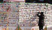 2022년 임인년을 앞두고 서울 종로구 조계사 마당에 설치된 ‘2022 소원의 탑’을 찾은 사람들이 14일 새해 소망을 적은 메모지를 걸고 있다. 신원건 기자 laputa@donga.com}