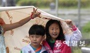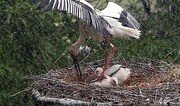 충남 예산군 황새공원 둥지 위에서 어미황새가 날개를 펴 새끼들이 비를 맞지 않도록 막아주고 있다. 새끼들은 순조롭게 성장해 이번 달 말쯤이면 어미의 곁을 떠날 것이라고 한국교원대 황새생태연구원이 밝혔다. 예산=박영대 기자 sannae@donga.com}