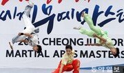 7일 서울 광화문광장에서 열린 ‘2016 청주세계무예마스터십대회 D-100일 기념행사’에서 무술인들이 무예 시연을 하고 있다. 9월 2∼8일 충북 청주시에서 세계 최초로 열리는 대회에서는 검도, 무아이타이 등 15개 종목에서 경기를 벌인다. 박영대 기자 sannae@donga.com}