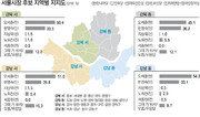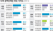 서울시장과 경기지사 선거에선 한나라당 후보가 선두를 달리는 것으로 조사됐다. 경기지사의 경우 야권 후보 단일화에 따른 표 결집 효과 여부를 좀 더 지켜볼 필요가 있는 것으로 분석된다.○ 서울 한나라당 오세훈 후보가 49.7%, 민주당 한명숙 후보가 32.3%, 진보신당 노회찬 후보가 4.3%의 지지율을 보였다. 자유선진당 지상욱 후보는 1.1%, 미래연합 석종현 후보는 0.1%로 나타났다. ‘반드시 투표할 것’이라는 ‘적극적 투표 의향층’에서는 오 후보가 53.1%, 한 후보가 33.7%로 1, 2위 격차가 2%포인트 더 벌어졌다. 성별로는 여성에서 오 후보가 51.8%, 한 후보가 30.2%로 남성 응답자(오 후보 47.6%, 한 후보 34.4%)보다 격차가 더 컸다. 여성들의 오 후보 선호는 직업별 조사에서도 드러났다. 가정주부의 62.4%가 오 후보를 지지한다고 밝혔고, 한 후보를 찍겠다는 응답자는 22.6%에 불과했다. 자영업자는 54.8% 대 29.3%로 오 후보 선호도가 25.5%포인트 높았다. 반면 블루칼라와 화이트칼라에서는 한 후보 지지도가 오 후보보다 각각 12.1%포인트와 12.4%포인트 높았다. 연령별로는 오 후보가 30대를 제외한 전 연령층에서 앞섰다. 특히 60대 이상에선 오 후보 지지율이 76.7%로 가장 높았다. 30대에선 한 후보(47.4%)가 오 후보(30.0%)보다 17.4%포인트 더 높았다. 지역별로는 서울 전역에서 오 후보가 고른 우위를 보였다. 특히 한나라당 강세 지역인 강남 동부권(서초 강남 송파 강동구)에서는 54.3%의 지지를 얻어 한 후보(33.1%)를 크게 앞질렀다. 한 후보는 민주당의 ‘강북 벨트’로 불리는 강북 동부권(도봉 강북 노원 성북 동대문 중랑 성동 광진구)에서 상대적으로 지지율(36.2%)이 높았지만 오 후보(45.1%)에게는 미치지 못했다.○ 경기 한나라당 김문수 후보(44.1%)가 국민참여당 유시민 후보(33.2%)를 10.9%포인트 앞선 것으로 조사됐다. 진보신당 심상정 후보는 2.8%였다. ‘적극적 투표 의향층’에서 김 후보는 47.9%, 유 후보는 36.7%, 심 후보는 1.2%를 얻었다. 한나라당 지지자의 84.0%가 김 후보를 찍겠다고 답했으며 유 후보에 대해선 민주당 지지자 가운데 61.4%가 지지한다고 밝혔다. 민주당 김진표 후보와 단일화를 했지만 아직까지 민주당 표심이 유 후보에게 다 오지는 않았음을 보여 줬다. 김 후보에 대한 지지는 50대 이상(50대 61.0%, 60대 이상 66.6%)에서 높았다. 유 후보는 20대(43.5%)와 30대(46.6%)에서 김 후보를 앞섰다. 40대에서는 김 후보 41.7%, 유 후보 35.6%였다. 지역별로는 경기 남부·임해권(수원 안성 오산 용인 안산 평택 화성)에서 김 후보가 48.7%를 얻어 강세가 두드러졌다. 유 후보는 16, 17대 국회의원 시절 자신의 지역구(고양 덕양갑)가 포함된 북부해안권(고양 김포 파주)에서 37.7%의 지지율을 기록해 김 후보(39.4%)와 오차범위 안에서 접전을 벌이는 것으로 나타났다. 직업별로는 농림어업과 자영업, 블루칼라, 가정주부 등이 김 후보를 선호했고, 화이트칼라와 학생은 유 후보를 더 지지했다. 학력별로는 고졸 이하에서는 김 후보가, 대학 재학 이상에서는 유 후보가 앞섰다.고기정 기자 koh@donga.com}