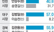전국 16개 시도지사 선거 판세를 조사 중인 본보와 코리아리서치센터(KRC)가 16, 17일 실시한 전화여론조사(직접 통화 방식) 결과 인천과 대구 경북은 한나라당 후보가, 호남은 민주당 후보가 앞서고 있는 것으로 나타났다. 인천에선 한나라당 안상수 후보(40.8%)가 민주당 송영길 후보(31.7%)를 9.1%포인트 앞섰다. 대구는 한나라당 김범일 후보(57.0%), 경북은 한나라당 김관용 후보(55.9%)가 압도적 우세를 보였다. 반면 호남에선 △광주 강운태 후보(56.5%) △전북 김완주 후보(57.5%) △전남 박준영 후보(61.4%) 등 민주당 후보들이 다른 후보들을 크게 앞질렀다. 본보는 이에 앞서 17일 서울 경기, 충청권, 부산 경남 울산, 제주 강원 10개 지역에 대한 조사 결과를 보도했다. 16개 시도지사 판세를 종합하면 한나라당이 8곳(서울 부산 대구 인천 울산 경기 경북 충북), 민주당이 3곳(광주 전남 전북), 무소속 1곳(제주), 오차범위 내 경합 4곳(대전 충남 경남 강원) 등인 것으로 분석됐다. 이번 조사는 서울 경기 각 800명, 나머지 14개 지역 각 500명 등 총 8600명을 대상으로 실시됐다. 표본 오차는 95% 신뢰구간에서 △서울 경기 ±3.5%포인트 △나머지 14개 지역 ±4.4%포인트다. 정용관 기자 yongari@donga.com}