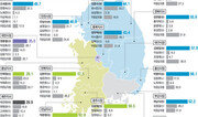 ‘수도권 한나라당 우세, 충청권 혼전, 영호남 지역구도 여전, 친노(親盧·친노무현) 후보들의 일부 지역 선전….’ 6·2지방선거 후보 등록(13, 14일)에 즈음해 전국 16개 시도를 대상으로 본보와 코리아리서치센터(KRC)가 실시한 광역단체장 전화 여론조사 결과를 종합해 보면 전국 판세는 이렇게 요약된다. 서울에선 현 시장인 한나라당 오세훈 후보(49.7%)가 대표적인 친노 인사인 민주당 한명숙 후보(32.3%)를 오차 범위를 벗어나는 격차를 보이며 앞섰다. 경기에서도 현 도지사인 한나라당 김문수 후보(44.1%)가 노 전 대통령의 ‘정치 경호실장’을 자처해 왔던 국민참여당 유시민 후보(33.2%)를 10%포인트가량 리드했다. 인천 역시 현 시장인 한나라당 안상수 후보(40.8%)가 민주당 송영길 후보(31.7%)를 앞섰다. 1, 2위 간 지지율 격차는 서울 경기 인천 순이었다. 반면 충남과 경남에선 친노 후보들이 선전하고 있다. 세종시 수정 찬반 논란의 진앙인 충남에선 단순 지지도에서 민주당 안희정 후보(28.1%)가 자유선진당 박상돈 후보(23.0%)를 앞질렀지만 ‘반드시 투표하겠다’는 적극적 투표 의향층에선 박 후보(28.5%)가 안 후보(26.7%)를 근소한 차로 앞서는 등 안갯속이다. 경남도 비슷한 양상이다. 무소속으로 출마했지만 야권 단일 후보로 민주당 민주노동당 등의 지원을 받고 있는 김두관 후보(39.0%)가 단순 지지도에서 한나라당 이달곤 후보(34.0%)를 앞섰지만 적극 투표 의향층에선 이 후보(39.4%)가 김 후보(36.9%)를 앞서는 등 한 치 앞을 내다볼 수 없는 접전이 펼쳐지고 있다. 충청권의 경우 대전에선 전 시장인 선진당 염홍철 후보(35.0%)가 현 시장인 한나라당 박성효 후보(28.1%)를, 충북에선 현 도지사인 한나라당 정우택 후보(43.4%)가 민주당 이시종 후보(34.1%)를 각각 6.9%포인트, 9.3%포인트 앞서는 등 한나라당 민주당 선진당이 물고 물리는 각축을 벌이는 형국이다. 영남권의 나머지 지역과 호남권은 각각 한나라당과 민주당 후보가 압도적 지지를 보여 전통적 지역구도에는 별 변화가 없을 것이란 전망이 나온다. 여야는 접전 지역 부동층(충남 33.7%, 경남 27.0% 등)의 표심을 잡기 위해 총력을 기울이고 있다. 천안함 침몰사건 조사 결과 발표(20일) 및 정부의 후속 대응, 노무현 전 대통령 서거 1주기(23일) 등에 따른 여론 흐름이 최종 판세에 영향을 줄 것으로 보인다.정용관 기자 yongari@donga.com ■ 인천안상수 전반적 우세… 부평·계양 송영길 앞서무응답 24.8%… 수도권 3곳중 가장 많아인천에선 한나라당 안상수 후보가 40.8%를 얻어 31.7%의 지지율을 보인 민주당 송영길 후보를 9.1%포인트 차로 앞섰다. 진보신당 김상하 후보는 1.8%, 평화민주당 백석두 후보는 0.9%에 그쳤다. ‘반드시 투표하겠다’고 밝힌 적극적 투표 의향층에서는 44.8%가 안 후보를, 33.1%가 송 후보를 지지한다고 답해 두 후보 간 격차(11.7%포인트)가 더 커졌다. 송 후보는 자신의 국회의원 지역구(계양구을)가 포함된 동부권(부평·계양구)에서 35.4%의 지지를 받으며 안 후보(33.8%)를 앞질렀다. 그러나 그 밖의 지역에서는 전반적으로 안 후보가 우세했다. 특히 서부도서권(서구 강화·옹진군)에서 두 후보 간 격차가 가장 크게 벌어져 천안함 침몰사건으로 안보 이슈가 부각되면서 이 지역의 보수색이 짙어진 것으로 해석됐다(안 후보 40.0%, 송 후보 21.8%) 40대 이상 자영업자와 가정주부 가운데 특히 안 후보를 지지하는 사람이 많았고, 송 후보는 30대, 블루칼라 업종에서 안 후보보다 우위였다. 성별로는 여성 응답자 중 40.1%가 안 후보를 지지한다고 밝힌 데 비해 송 후보를 지지한다고 답한 여성 응답자는 28.3%로 낮았다. 남성에서는 차이가 줄었다(안 후보 41.4%, 송 후보 35.1%). “선거일에 지지 후보를 정하겠다”거나 응답하지 않은 비율은 24.8%로 수도권에선 부동층이 가장 많은 것으로 나타나 향후 선거전 분위기에 따라 지지율 변동 여지가 큰 것으로 나타났다. 최근 본보가 조사한 서울시장, 경기지사 지지도 여론조사에서 무응답층은 각각 12.5%와 19.9%였다. 류원식 기자 rews@donga.com ■ 광주·전북·전남민주 독주… 다른 모든 후보 10%도 못넘겨한나라, 광주-전북서 2위… 전남 2위는 민노광주, 전남북은 모두 민주당 후보가 큰 격차로 선두를 달리고 있다. 광주시장 선거에서는 민주당 강운태 후보가 56.5%로 압도적 우세를 보였다. 노무현 정신 계승을 표방하는 국민참여당의 정찬용 후보(4.2%)는 민주노동당 장원섭 후보(6.2%)에 이어 4위에 머물렀다. 참여정부에서 대통령인사수석비서관을 지낸 데다 이병완 전 대통령비서실장을 경선에서 꺾고 본선 티켓을 따내 ‘다크호스’로 부상할 가능성이 제기되기도 했지만 아직은 주목할 만한 바람을 일으키지 못하고 있다. 국민참여당을 지지한다는 응답자의 31.7%가 강 후보에게 투표하겠다고 밝혔다. 강 후보는 동구를 제외한 전 지역에서 50% 이상의 지지율을 보였다. 이명박 대통령의 연설기록비서관 출신인 한나라당 정용화 후보는 8.0%를 얻어 1위와의 격차는 크지만 2위를 했다. 정 후보는 동구(11.6%)와 서구(12.5%)에서 두 자릿수 지지율을 올렸다. 한편 옛 전남도청 소재지로 ‘광주 정치의 1번지’라고 불리는 동구는 민주당(54.9%)의 지지율