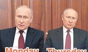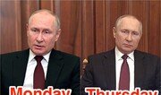 블라디미르 푸틴 러시아 대통령의 24일 우크라이나 침공 개시 TV 연설이 사전 녹화된 것이라는 의혹이 제기됐다고 영국 파이낸셜타임스(FT) 등이 보도했다. FT에 따르면 이런 의혹의 발단은 푸틴 대통령 옷이다. 그는 이날 방영된 대국민 연설 영상에서 흰색 셔츠에 검은색 정장, 붉은색 넥타이(사진)를 착용했다. 그런데 이 복장은 21일 우크라이나 돈바스 지역 친러시아 반군 세력의 도네츠크인민공화국(DPR)과 루간스크인민공화국(LPR) 독립을 승인하는 공개 연설 때 입은 복장과 같았다. 그가 연설한 장소와 그가 카메라를 바라보던 위치도 같았다. 푸틴 대통령은 21일 “LPR와 DPR가 요청하면 러시아군을 돈바스로 보내겠다”고 말했고 그 이틀 뒤 LPR, DPR 수장들은 그의 말대로 지원을 요청했다. 만약 두 영상이 한날 촬영됐다면 우크라이나 침공이 사전 각본대로 이뤄졌다는 방증이 된다. ‘사전 녹화 논란’은 푸틴 대통령이 21일 소집한 긴급 국가안보회의 영상에서도 있었다. 이 회의는 같은 날 오후 5시 TV 중계됐다. 하지만 영상 속 세르게이 쇼이구 국방장관을 비롯해 각료들이 차고 있던 손목시계는 11시 45분을 가리키고 있었다. 러시아 대통령실 크렘린궁은 이 회의가 사전에 녹화됐다고 뒤늦게 시인했다.신아형 기자 abro@donga.com}