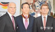 정몽준 새누리당 의원이 한국과 독일 간 경제 협력과 독일 축구 발전에 기여한 공로로 독일 정부로부터 대십자공로훈장을 받았다. 3일 주한 독일대사관에 따르면 정 의원은 이날 서울 성북구 성북동 주한 독일대사관저에서 롤프 마파엘 독일대사로부터 대십자공로훈장을 전달받았다. 대십자공로훈장은 독일 정부가 민간인에게 수여하는 최고의 훈장이다. 이날 훈장 수여식에는 독일 바이에른 뮌헨 축구팀의 프란츠 베켄바워 명예회장과 독일 선박회사인 E R 캐피털홀딩그룹의 에르크 리크머스 회장 등이 참석했다. 이서현 기자 baltika7@donga.com}