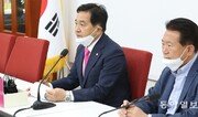 심재철 미래통합당 원내대표 겸 대표 권한대행(왼쪽)은 26일 국회 에서 열린 기자간담회에서 성 추문으로 사퇴한 오거돈 전 부산시장을 향해 “현행범으로 처벌해야 한다”고 목소리를 높였다. 심 대표는 “이미 성 파문을 일으킨 안희정 전 충남지사, 정봉주 전 의원, 민병두 의원, 경기 안산 단원을 김남국 당선인, (최근 동료를 성폭행한) 박원순 서울시장 비서실 직원 모두 더불어민주당”이라며 “가히 ‘더듬어 민주당’이자 ‘더불어 미투(me too)당’”이라고 비난했다. 김재명 기자 base@donga.com}