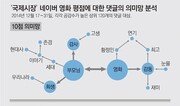 뒷심이 무섭다. 영화 ‘국제시장’이 지난 주말 700만 관객을 돌파한 데 이어 이르면 5일 800만 명 돌파를 눈앞에 두고 있다. 이 영화의 배급사인 CJ엔터테인먼트 측은 4일 “개봉 3주 차에 700만 명을 넘어 지금 추세라면 1000만 명을 돌파할 것으로 본다”고 밝혔다. ‘국제시장’은 일반적인 ‘1000만 영화’들과는 조금 다른 흥행 곡선을 보이고 있다. 개봉 1, 2주에 각종 최단 기록을 갈아 치우며 관객을 모으다가 3주 차부터 줄어드는 것과 달리 ‘국제시장’은 시간이 지날수록 흥행에 가속도가 붙는 모양새다. 특히 3주 차인 지난해 12월 31일부터 3일까지 나흘 동안에 233만 명이 관람해 이 기간 중 역대 최다 관객을 모았다. 개봉 첫 주 기대에 다소 못 미쳤던 ‘국제시장’ 흥행에 불을 지핀 것은 ‘보수 영화’ 논란과 영화를 둘러싼 정치·이념·세대 논쟁이다. 허지웅 영화평론가의 발언으로 촉발된 진영 갈등은 박근혜 대통령의 애국심 강조 발언, 김무성 새누리당 대표와 문재인 새정치민주연합 의원의 영화 관람까지 일련의 과정을 겪으며 확대됐다. 정지욱 영화평론가는 “영화 ‘변호인’ 때도 그랬듯 영화를 둘러싼 정치적 논란과 진영 싸움은 사회적 이슈를 만들어 내며 흥행에 보탬이 됐다”고 말했다. ‘국제시장’에 대한 관객 반응은 “‘한강의 기적’을 이뤄 낸 윗세대가 자랑스럽게 느껴지는 감동적인 영화”와 “산업화 세대가 기억하고 싶은 추억만 간추려 신파조로 엮은 영화”로 엇갈린다. 극단적인 시각차는 온라인 댓글에서도 확인된다. 동아일보 영화팀은 의미망 분석 업체인 트리움에 의뢰해 지난해 12월 17일 개봉한 이후 31일까지 네이버 영화 섹션에 올라온 국제시장의 댓글을 살펴봤다. 최고 평점인 10점을 준 누리꾼의 댓글 중 ‘공감한다’는 클릭 수가 가장 많은 120개를 뽑아 분석했다. 영화를 지지한 이들의 반응은 ‘부모 세대의 희생에 감사하고 그 덕분에 우리가 있었다’ ‘영화 자체가 감동적이고 연기력도 훌륭했다’로 요약된다. 키워드로는 ‘감동’ ‘부모님’ ‘눈물’ ‘황정민(배우)’ ‘감사’ ‘세대’ ‘희생(고생)’의 빈도가 높았다. 반면 최하 평점인 1점을 준 댓글 중 공감 빈도가 높은 120개를 분석해 보니 △아버지 세대의 희생에 공감을 강요하는 것에 대한 반감 △윤제균 감독의 연출력에 대한 비판 △지나치게 좋은 평점에는 일베(일간베스트) 같은 배후가 있다는 의혹 제기 등이 표출됐다. 키워드 역시 ‘억지’ ‘강요’ ‘신파(감성팔이)’ ‘일베충’ 등 부정적 단어들이 등장했다. 10점 만점을 준 관객이 부모의 희생에 감동을 ‘느꼈다’면, 1점을 준 관객은 부모 세대의 희생을 강조한 전개에 불편해하고 정치적인 의도를 ‘읽었다’고 할 수 있다. 이에 대해 이종대 트리움 이사는 “의미망 분석 결과 두 집단 모두 영화 속 아버지의 희생에 주목한 것은 공통점이지만 시각은 상이해 결국 윗세대의 희생을 어떻게 바라보느냐가 영화에 대한 호불호를 가르는 중요한 역할을 했다”고 분석했다. 포털 사이트 이용자의 ‘성향’에 따라서도 영화 평점이 엇갈렸다. 네이버의 경우 10점 만점에 9.0점이었다. 반면 아고라를 중심으로 진보 목소리가 강한 다음에서는 누리꾼 평점이 6.9점에 그쳤다.구가인 기자 comedy9@donga.com}