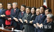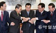 30일 서울 영등포구 여의도 국회 운영위원장실에서 여야 원내대표단이 올해 마지막 주례회동을 마친 뒤 손을 맞잡고 포즈를 취했다. 왼쪽부터 새정치민주연합 안규백 원내수석부대표, 새누리당 주호영 정책위의장, 새정치연합 우윤근 원내대표, 새누리당 이완구 원내대표, 새정치연합 백재현 정책위의장, 새누리당 김재원 원내수석부대표. 변영욱 기자 cut@donga.com}