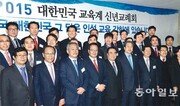 한국교원단체총연합회 신년 교례회가 정치계, 교육계 주요 인사들이 참석한 가운데 9일 서울 종로구 세종문화회관에서 열렸다. 설훈 국회 교육문화체육관광위원장(새정치민주연합), 황우여 사회부총리겸 교육부 장관, 안양옥 교총 회장, 정의화 국회의장, 문희상 새정치민주연합 비상대책위원장, 김무성 새누리당 대표, 성낙인 서울대 총장, 이군현 새누리당 사무총장(전 한국교총 회장), 나경원 새누리당 국회의원(앞줄 왼쪽부터) 등이 기념촬영을 하고 있다. 변영욱 기자 cut@donga.com}