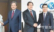 새누리당 김무성 대표가 13일 대표 취임 후 처음으로 종교계 지도자들을 찾았다. 이날 오전 조계사를 찾아 자승 총무원장과의 면담에 앞서 악수를 나누는 모습(왼쪽 사진). 김 대표는 오후에는 한국기독교총연합회 이영훈 대표회장을 만나 신년 인사를 전했다. 김 대표는 조만간 천주교 등 다른 종교계 지도자들도 예방할 예정이다. 변영욱 기자 cut@donga.com}