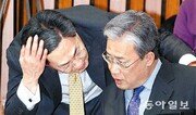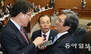 11일 이틀째 국회에서 열린 이완구 국무총리 후보자에 대한 인사청문회에서 새누리당 간사 정문헌 의원(왼쪽)과 새정치민주연합 간사 유성엽 의원이 청문회 진행과 관련해 심각한 표정으로 대화를 나누고 있다. 변영욱 기자 cut@donga.com}
