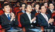 야권의 차기 대권 주자로 꼽히는 안희정 충남도지사와 새정치민주연합 안철수 의원, 박원순 서울시장(앞줄 왼쪽부터)이 11일 국회에서 열린 ‘더미래연구소’ 창립식 및 창립기념 토론회에 나란히 참석했다. ‘더미래연구소’는 새정치연합 내 진보 성향 초·재선 의원들이 만든 자체 싱크탱크다. 또 다른 대권 후보인 새정치연합 문재인 대표는 이날 대전 방문 일정 때문에 행사에 참석하지 못했다. 변영욱 기자 cut@donga.com}